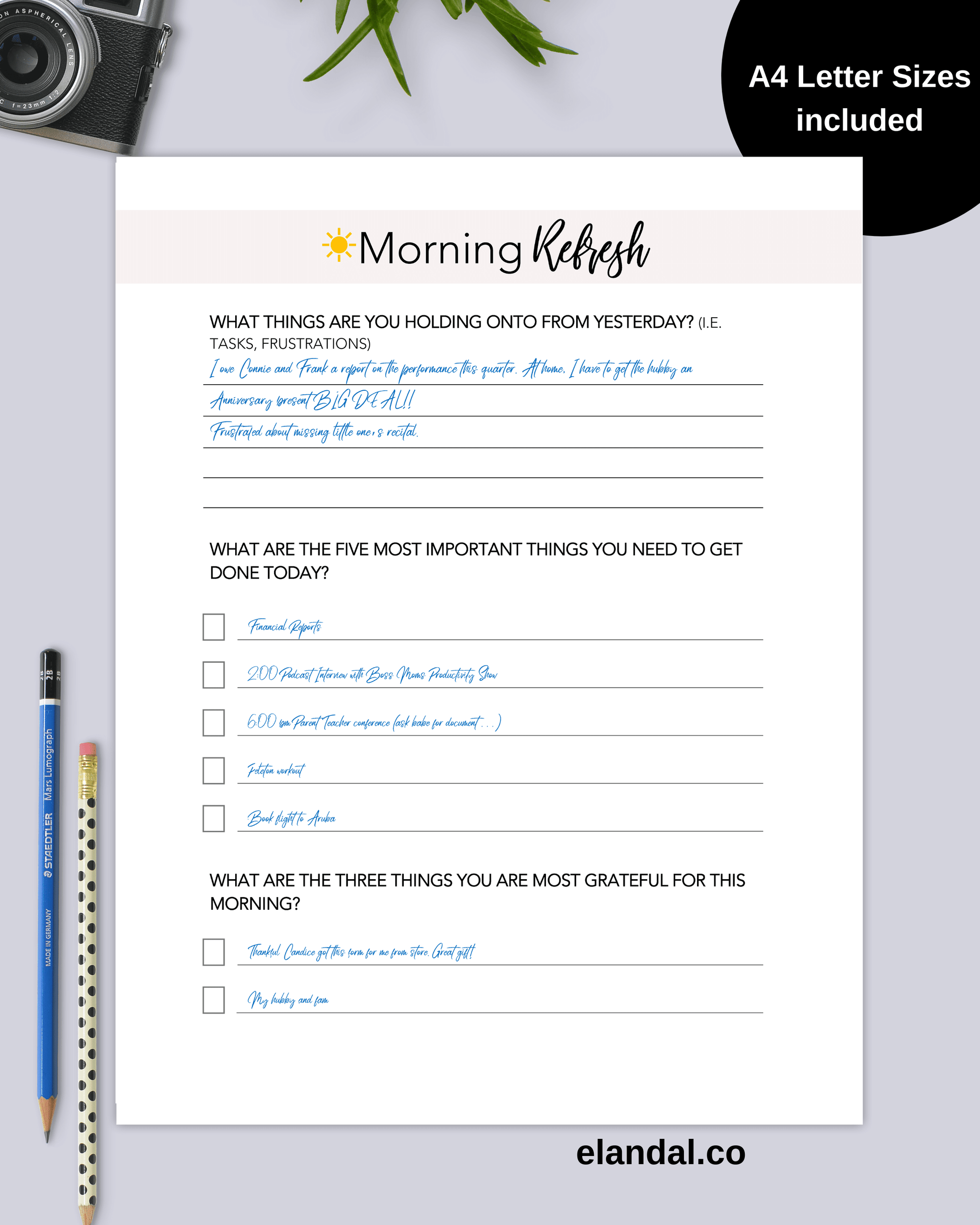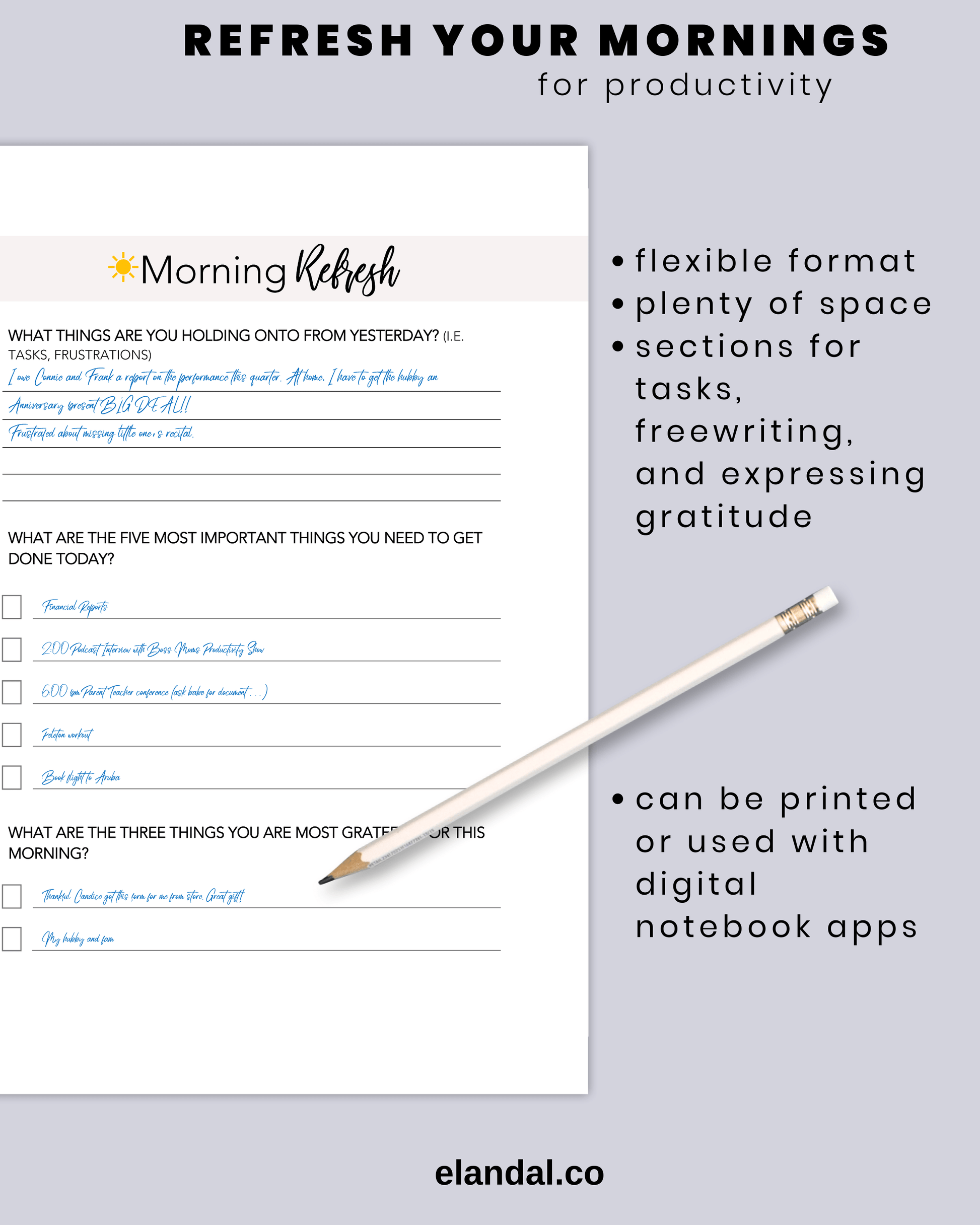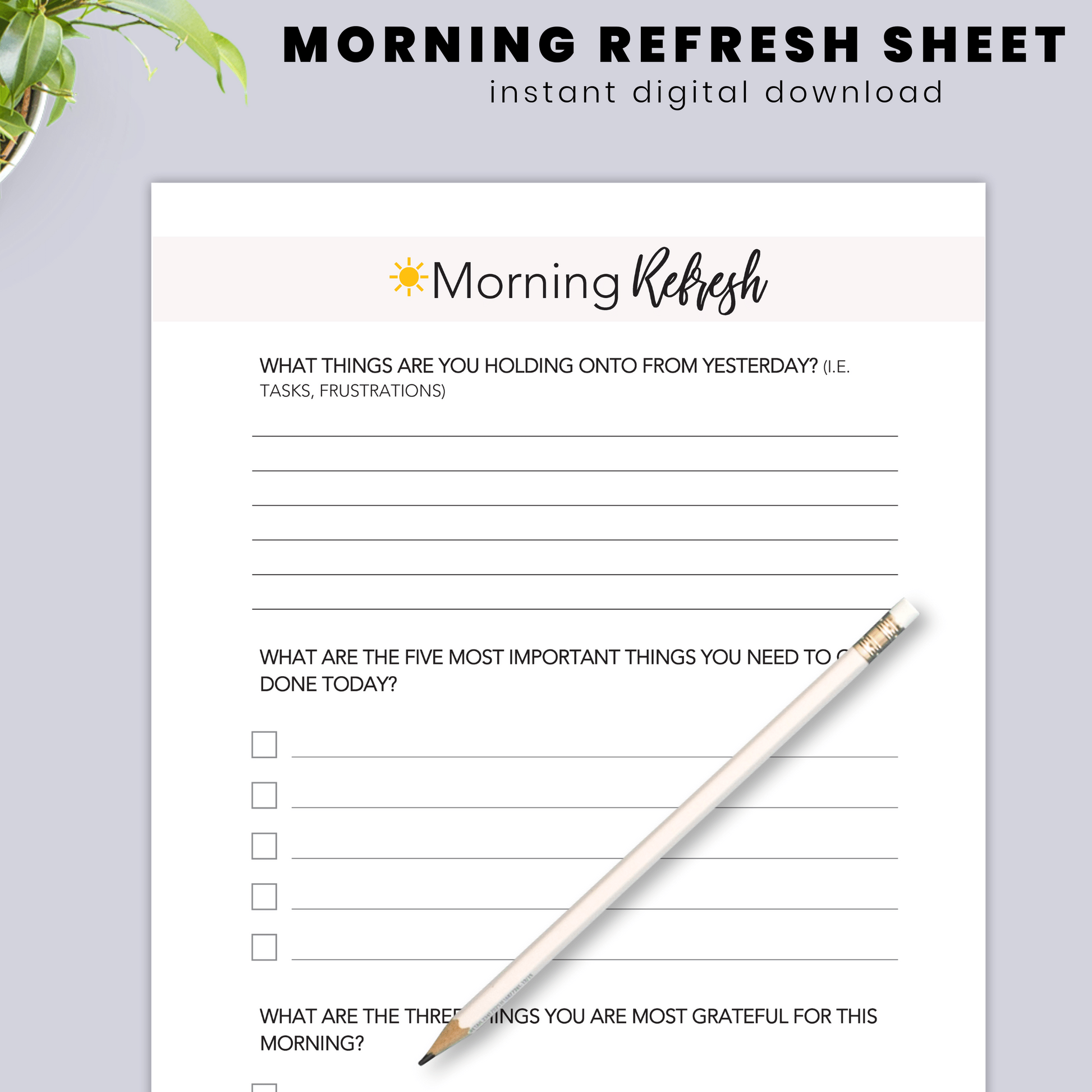 Refresh your morning routine to improve productivity and bring balance to your work and life. El and Al Co's Morning Refresh printable features sections for freewriting, listing tasks for the day and expressing gratitude.