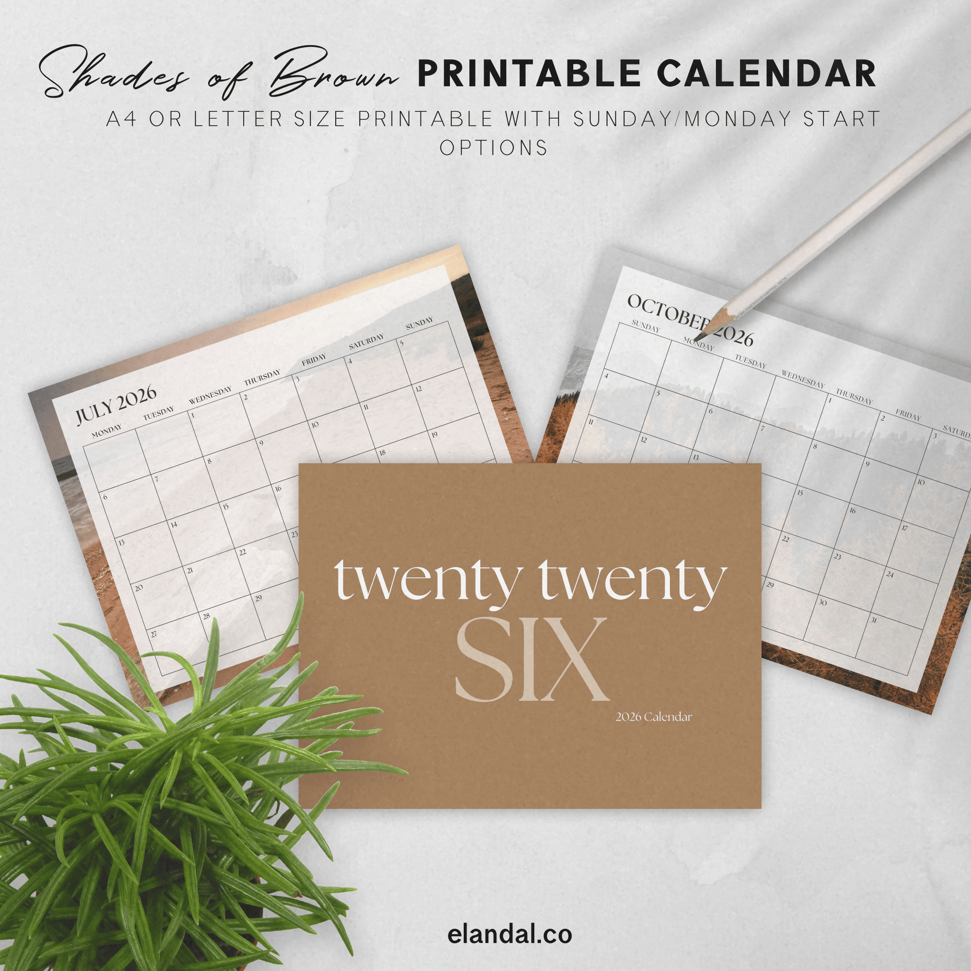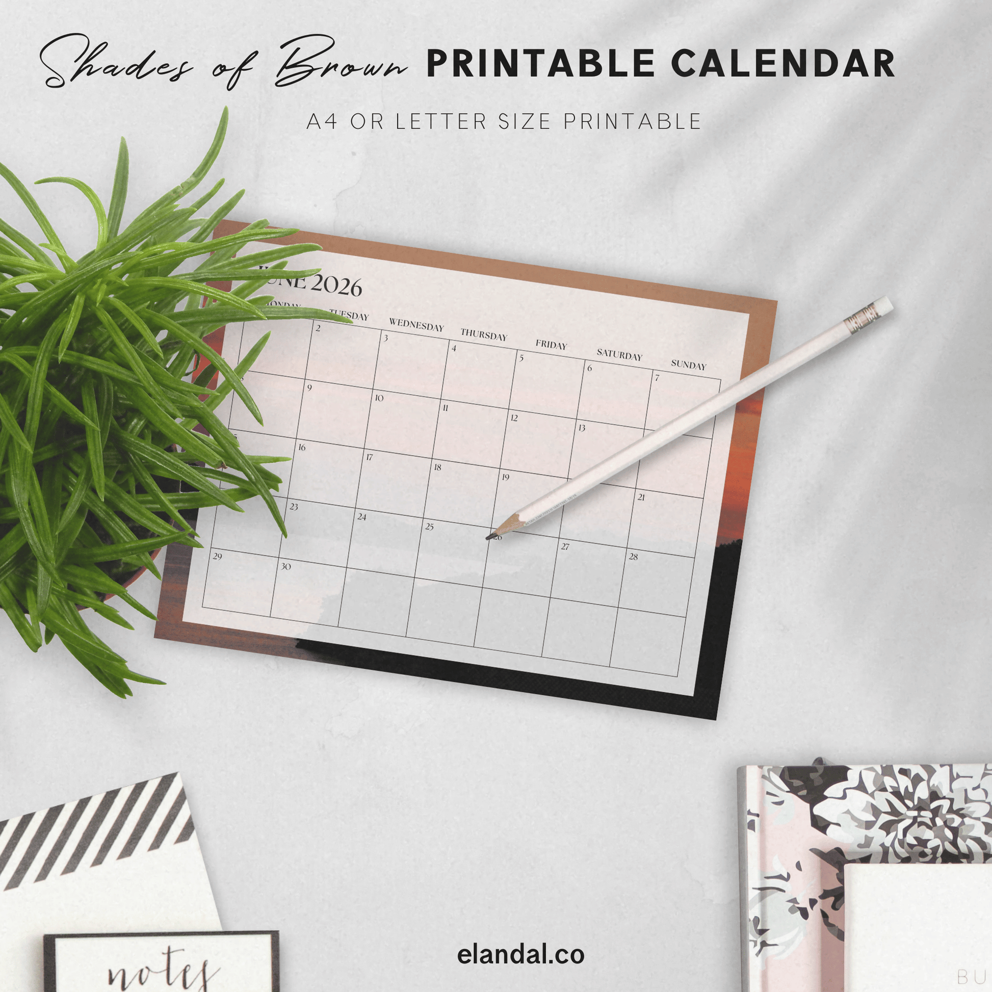 Un calendario horizontal de página completa de diseño minimalista que celebra los numerosos tonos de marrón.