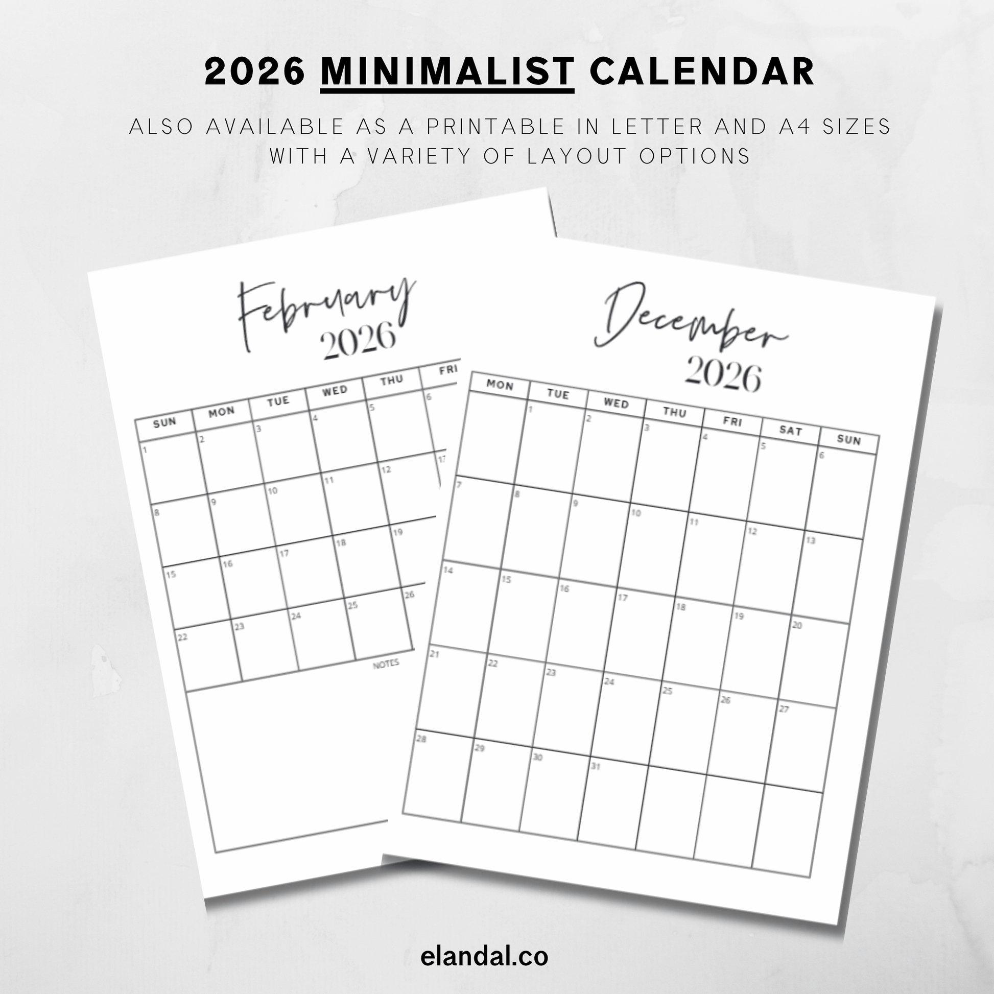 2026 Print Minimal Full Page Vertical Calendar