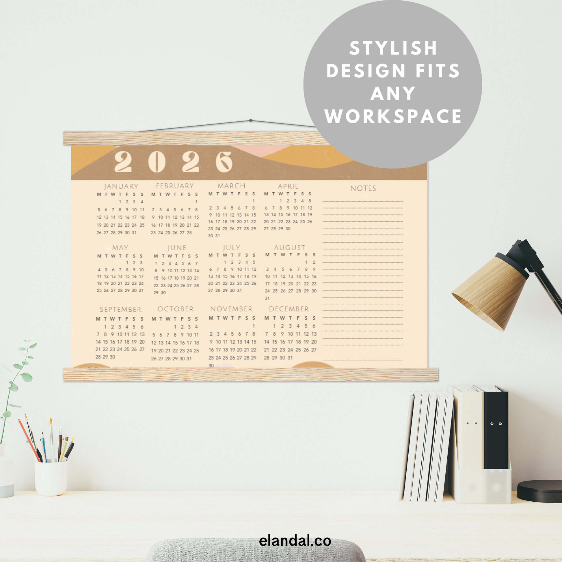 Elevate your workspace or living room with our 2026 Print Vintage Mountains Landscape Calendar! This minimalist calendar features a charming illustration of mountain terrain in a vintage style. Available in three sizes, this hanging calendar print is the must-have piece for you.